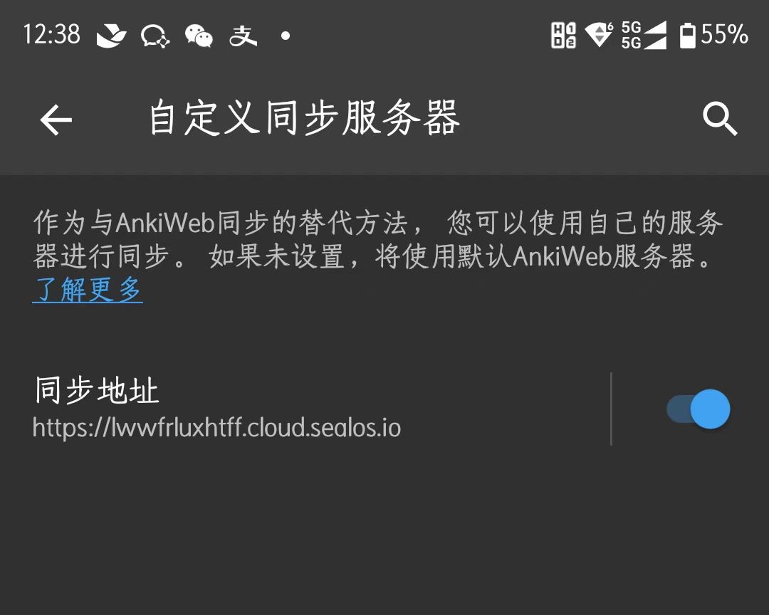 安卓端也是直接配置即可,我的 AnkiDroid 版本是 2.15.6。你可以通过「设置 -> 高级设置 -> 自定义同步服务器」找到配置页面。