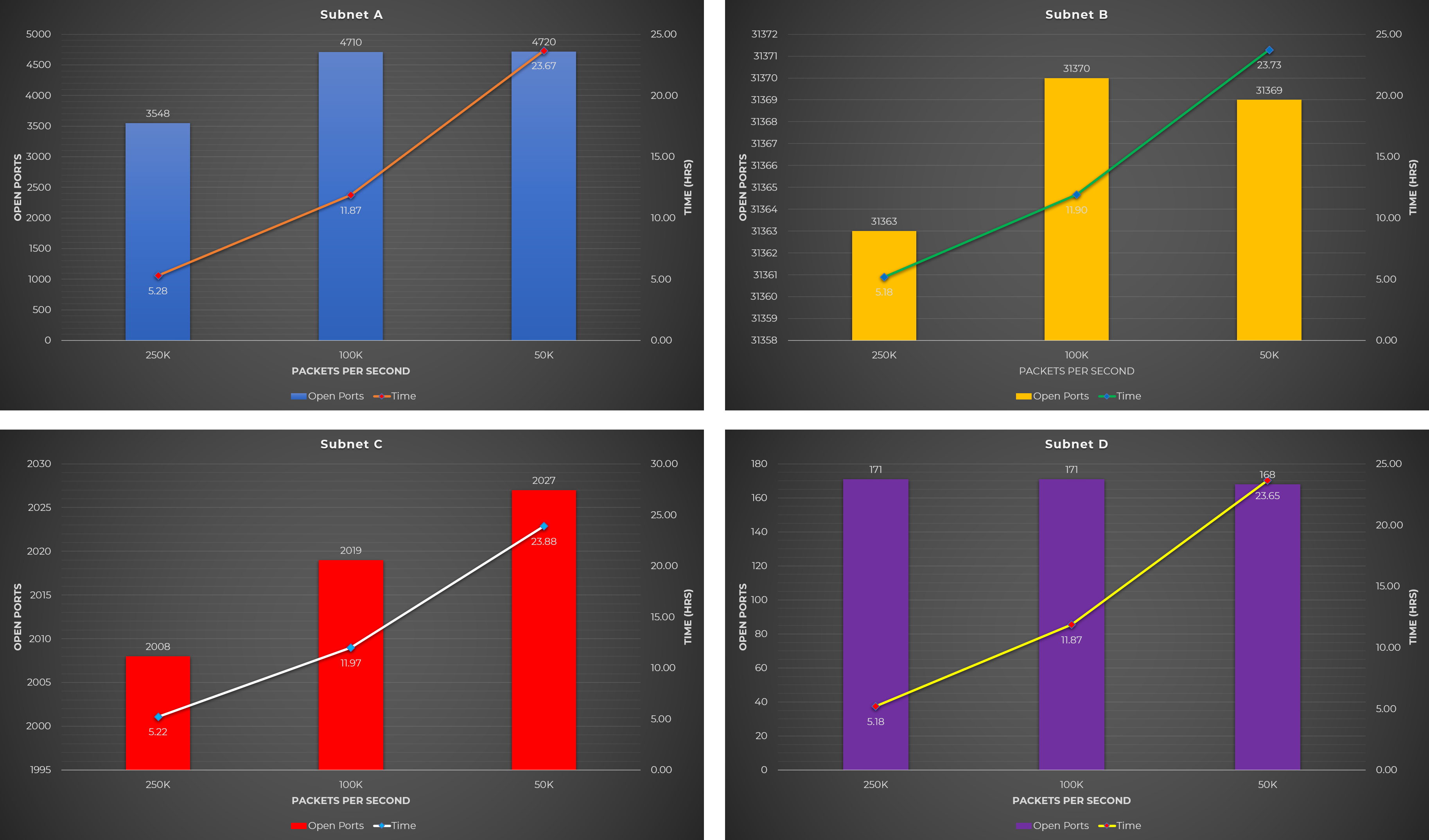 与基线(上面图表中的绿色条)相比,在某些目标网络(子网 A)上识别出更多的开放端口,而在其他的网络目标(子网 B 和子网 C)上检测到的开放端口较少,在某些网络目标(子网 D)上没有太大差异。