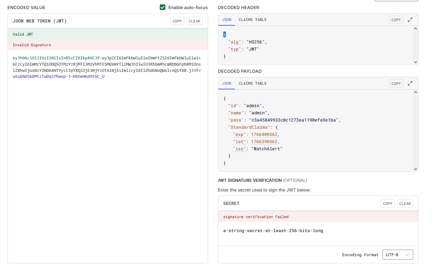 Authorization: Bearer eyJhbGciOiJIUzI1NiIsInR5cCI6IkpXVCJ9.eyJpZCI6ImFkbWluIiwibmFtZSI6ImFkbWluIiwicGFzcyI6Inh4eCIsImV4cCI6MTc2NjQwMzk4MywiaWF0IjoxNzY2Mzg1OTgzLCJpc3MiOiJXYXRjaEFsZXJ0In0.cxM_XWjJyJh-WpXYt1n4MH4A6mT-BtLO8r8DDkr3ngw